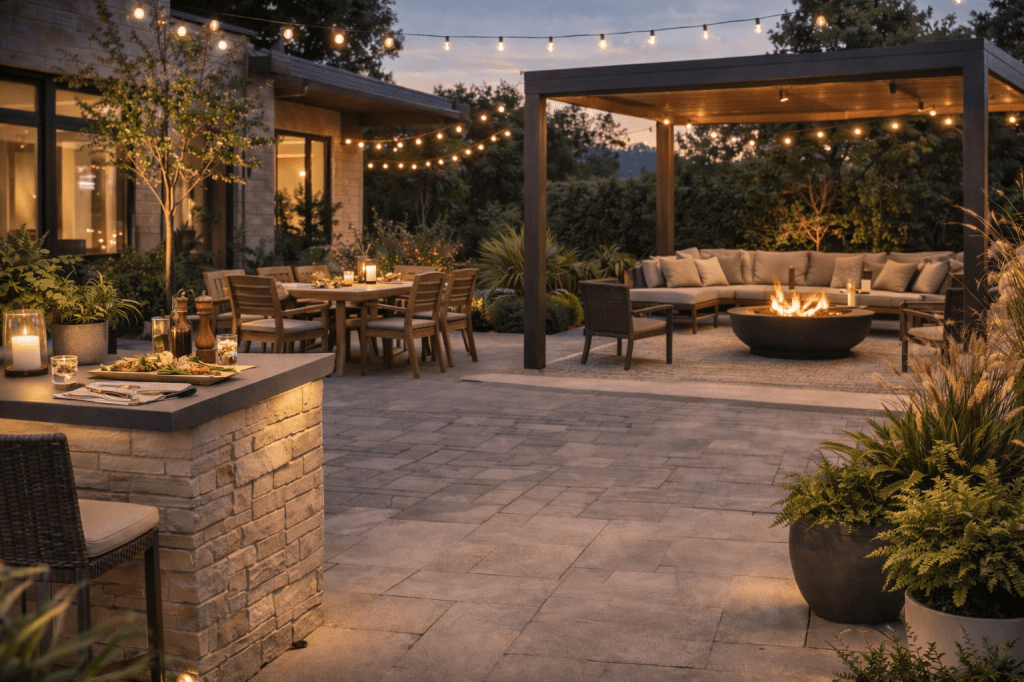 What makes this kind of backyard feel elevated is not just the individual pieces. It is the flow between them. The grill or outdoor kitchen area feels connected to the dining space. The dining space transitions naturally into the lounge area. The pergola gives shape, the fire table gives warmth, and the lighting carries the entire setting into the evening.