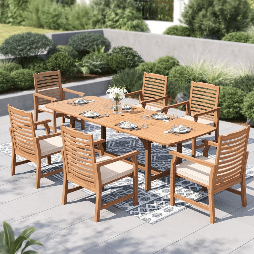 The dining area should feel welcoming enough for a casual weeknight meal and polished enough for a weekend gathering. A wood outdoor dining set does that beautifully. It adds warmth, texture, and a slightly more organic note to a backyard that might otherwise feel too hard or heavily architectural.
